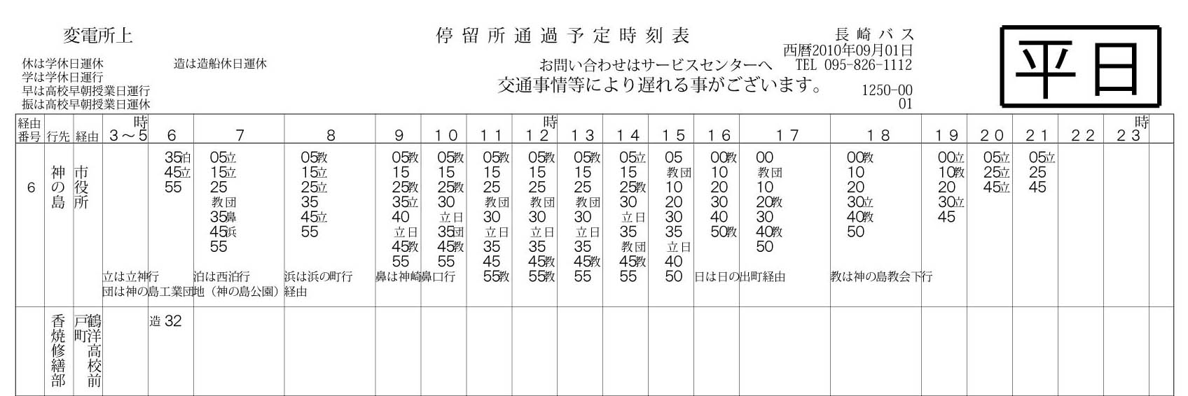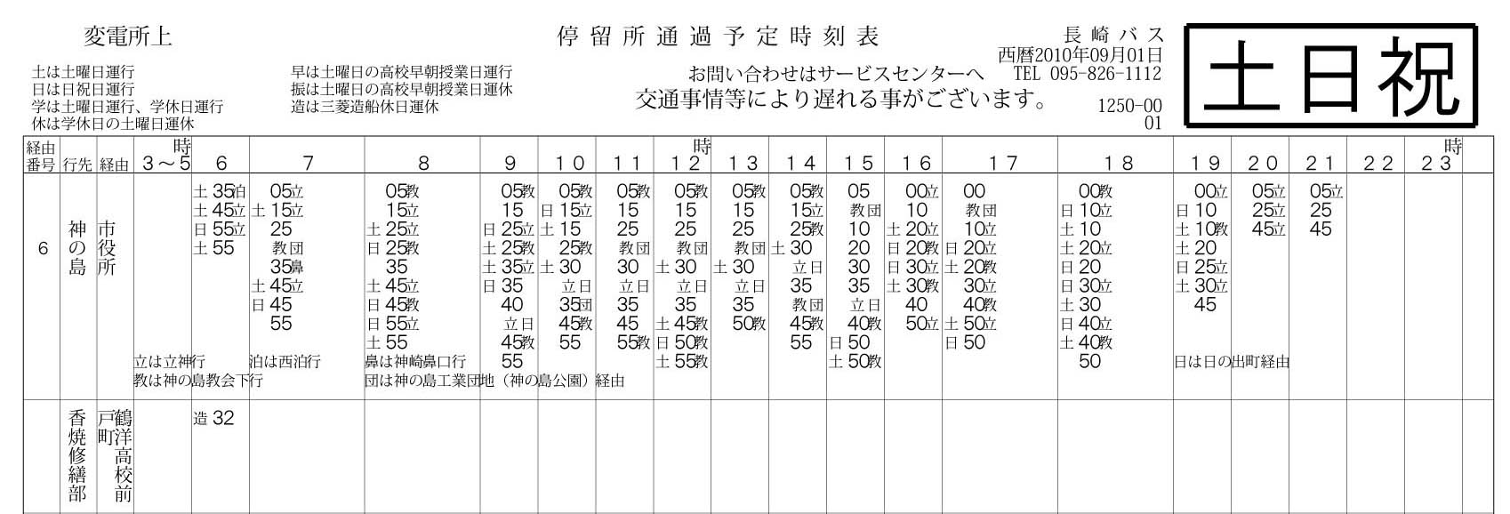 変電所上バス停から市の中心部へ向かう路線の時刻表です。
